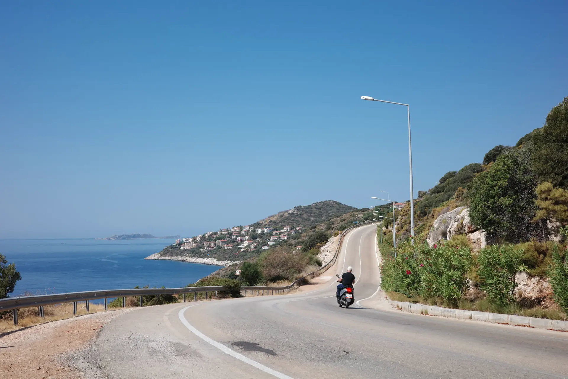 On the west side of Kaş lies a peninsula, shaped like a piece of dough squeezed out by hand—narrow at the tip and wide at the base. Heading north from the busy town center and turning past a fork in the road, you reach its entrance. A large ring road encircles the entire peninsula. Just follow it forward—no guidance needed, few cars, excellent road conditions.
