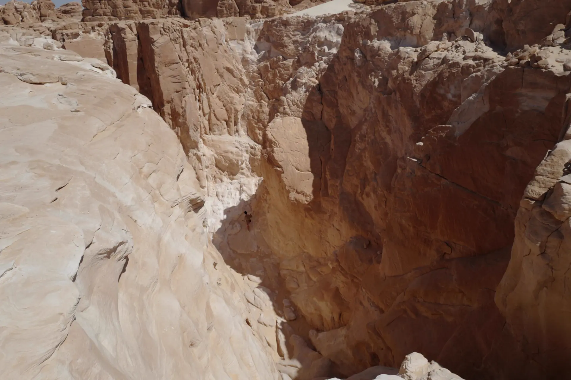 The path down the canyon wasn’t difficult but was steep. Many tourists had passed, and the rocks had clear footholds. A rope hung down to the valley floor. Holding it tightly, step by step, we followed the guide’s instructions and quickly reached the bottom. Huge white rock walls surrounded us, stretching upward and blocking part of the sky and sunlight. Without sunlight, I suddenly felt a chill. The milky white rocks were round and smooth with a matte texture. Touching them gently, fine white sand came off easily, feeling somewhat fragile. Layers of rock had accumulated over time, with different colors and textures forming stripes. The flowing shapes looked like threads drifting on the walls. Being inside felt like entering a funhouse maze, full of surprises and far from boring.