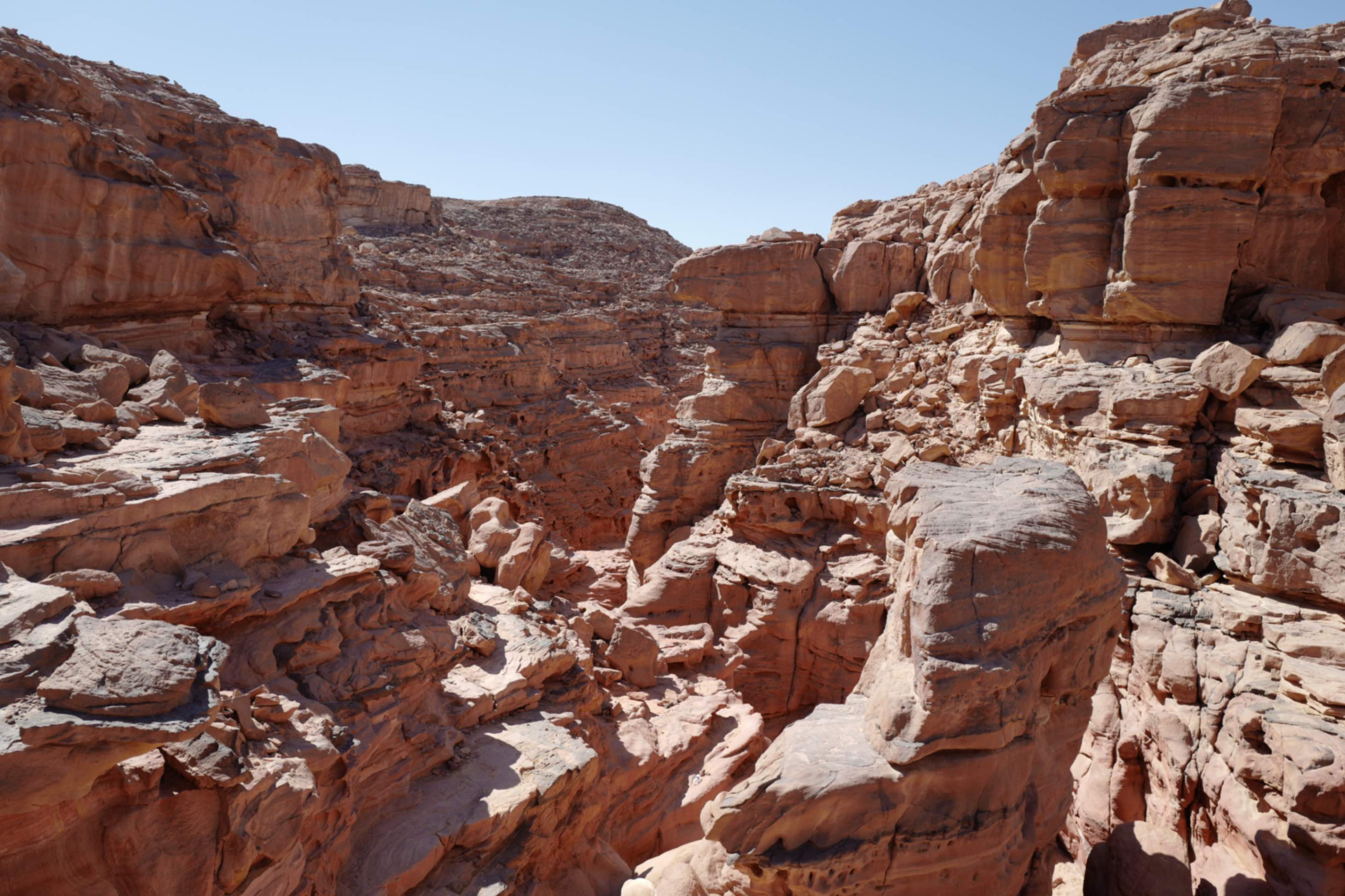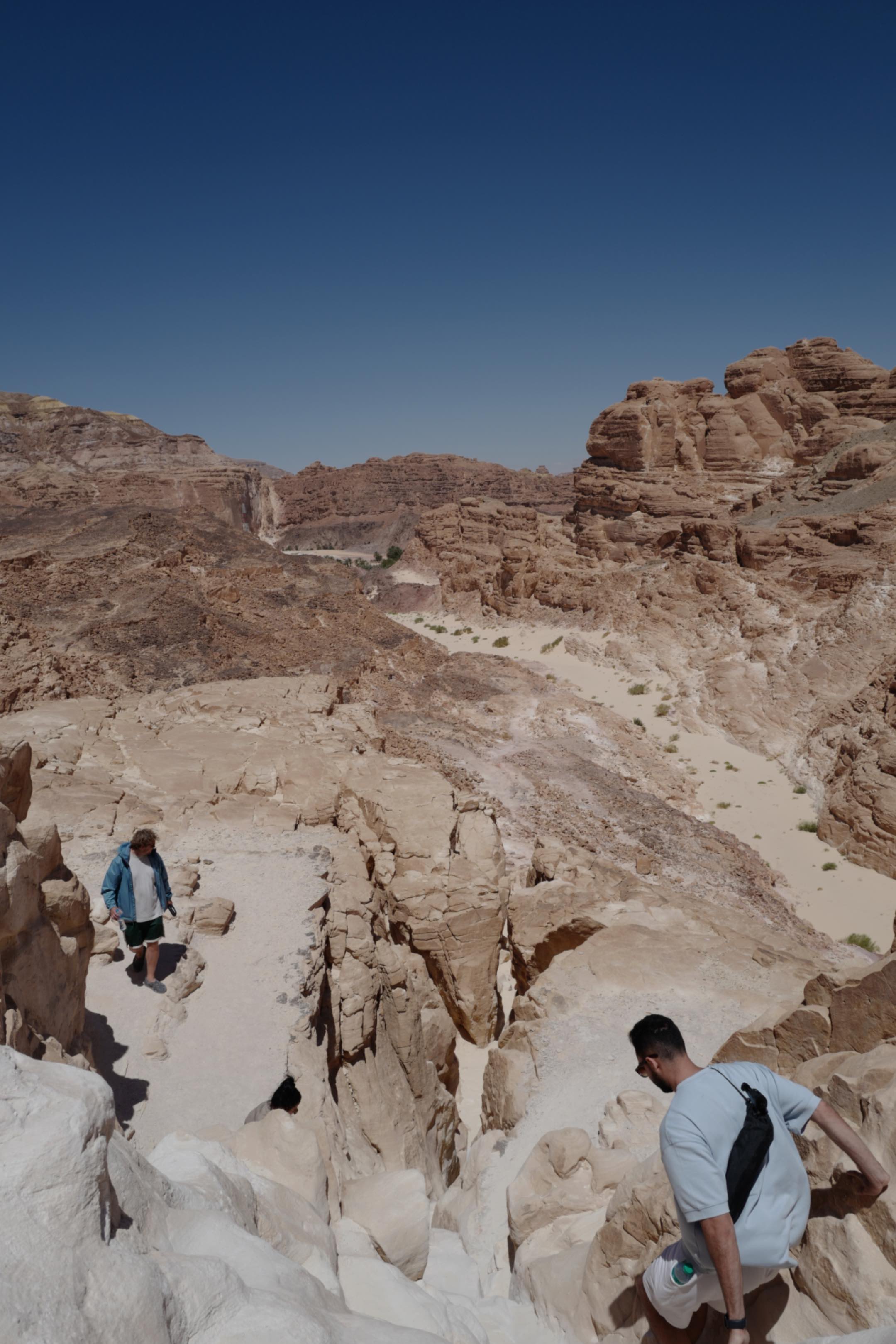 The canyon trail wasn’t always smooth. Sometimes we reached forks and had to wait for the guide’s instructions. The guide was a Bedouin man wearing a red headscarf, T-shirt, and cloth pants, with simple sandals. He carried no special gear, just a bottle of water. He was very responsible, moving back and forth to ensure no one was left behind or lost.