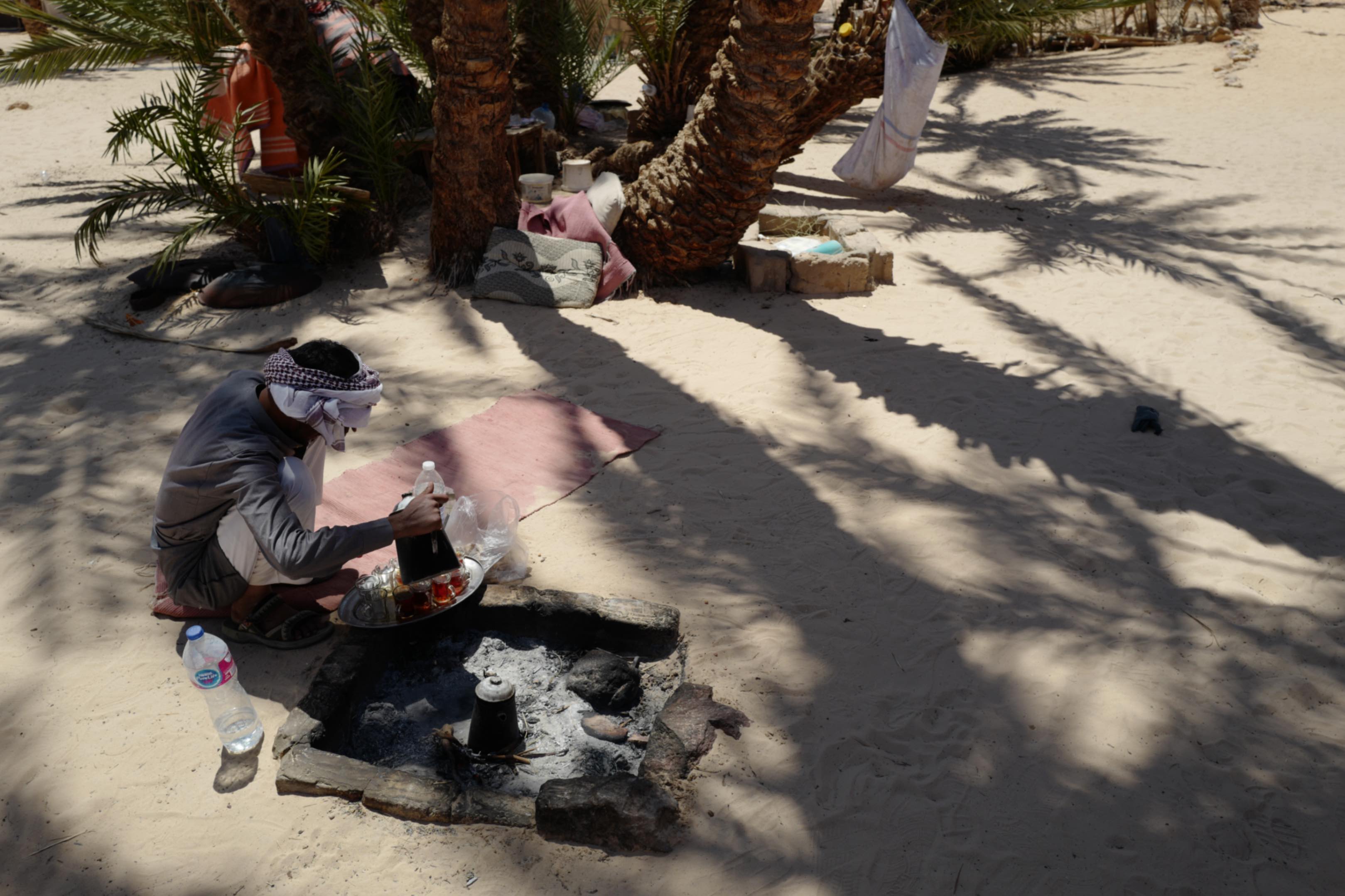 The canyon’s end was an oasis filled with signs of local life. The guide led us into a shelter to rest. The roof was made of palm leaves, and underneath were Arabic carpets and cushions. But after long use and many visitors, the carpets were gray, messy, and worn. Light filtered through the sparse palm leaves, swaying gently in the breeze, creating a dreamlike atmosphere. Next to the shelter was a fire pit, where another Bedouin squatted, brewing tea. He slowly lifted the kettle of boiling water and poured tea steadily into cups.