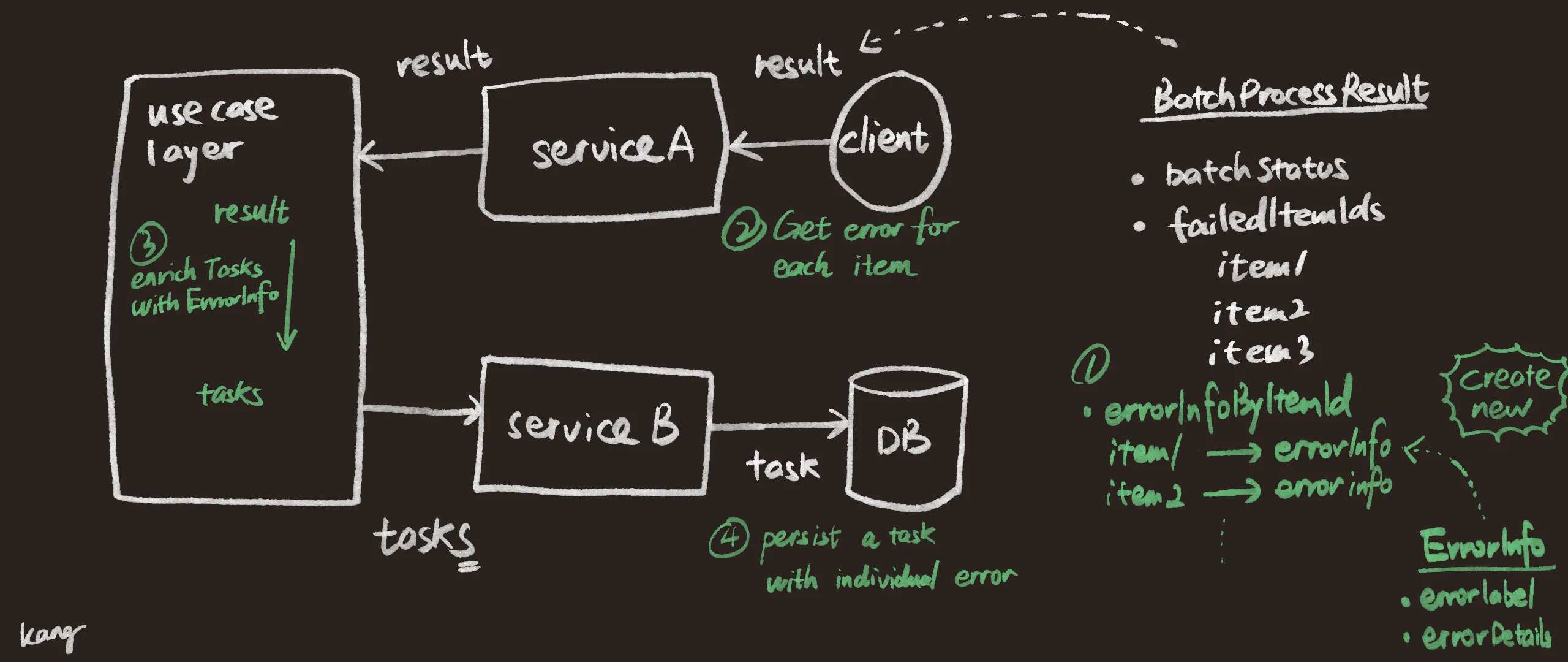 This is the step to integrate or align the task and the result. In the use case layer after getting the BatchProcessResult from the lower levels, we do not throw it directly to the Repository. Instead we enrich the task information based on the result by assigning the error details passed from below to the Task entity according to the itemId via enrichTasksWithErrorInfo().